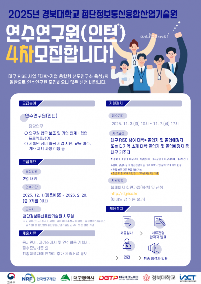 경북대학교 첨단정보통신융합산업기술원에서 대구RISE사업의 일환으로 연수연구원(인턴)을 모집하오니 역량 있는 분들의 많은 지원 바랍니다.
