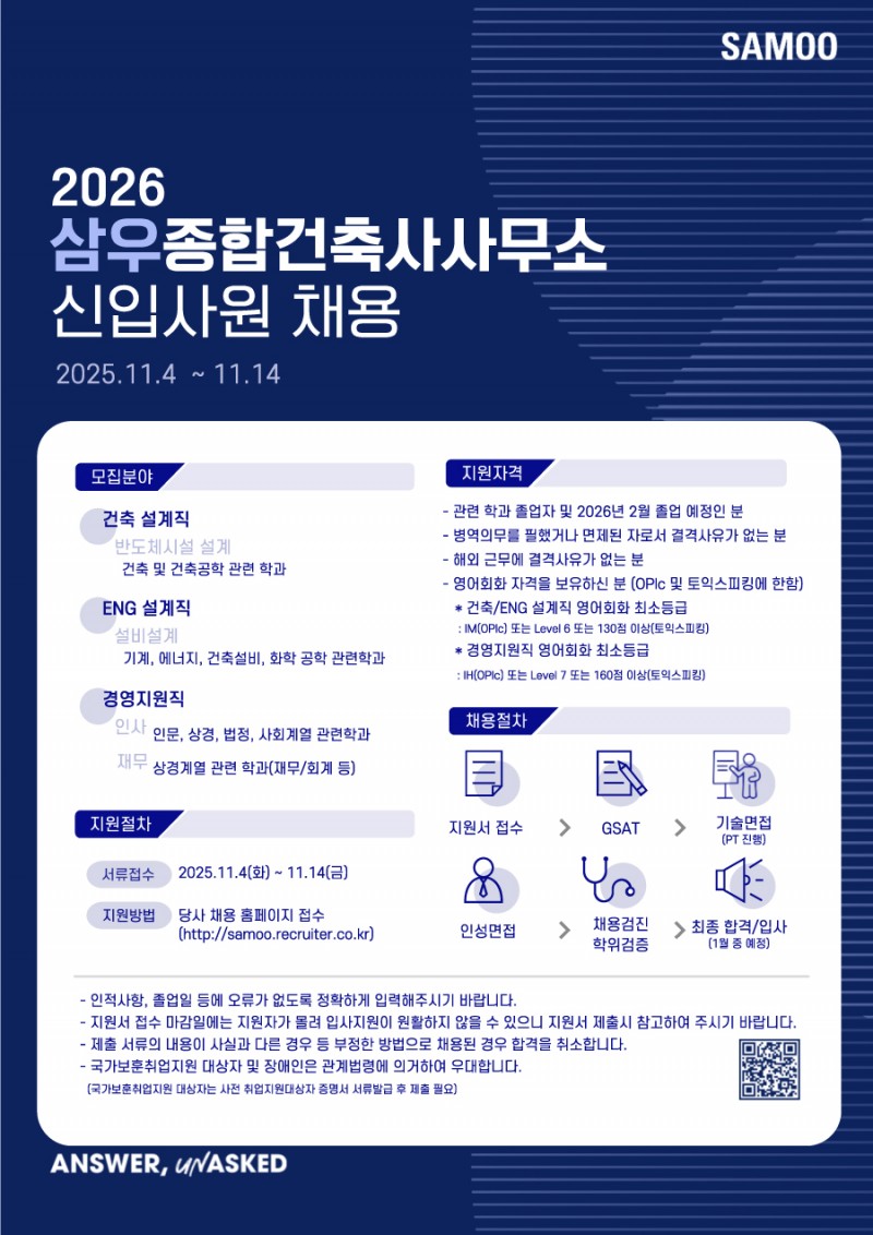 삼우는 건축설계를 비롯하여 도시설계, 실내설계, 엔지니어링, 친환경 설계 등 전 분야에 걸친 Total Solution을 제공하는 글로벌 건축설계사 입니다.1976년 설립된 이후, 900명이 넘는 우수한 전문인력을 바탕으로 8000여 개 이상의 프로젝트를 수행해 왔습니다. 100건이 넘는 수상실적은 삼우가 지난 49년간 쌓아 온 디자인 역량을 말해 주고 있습니다.