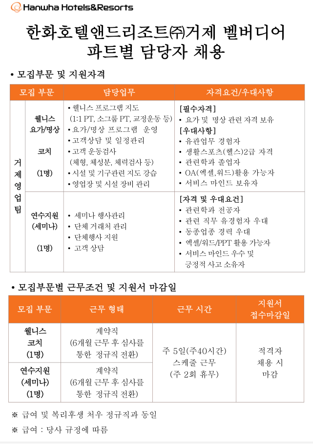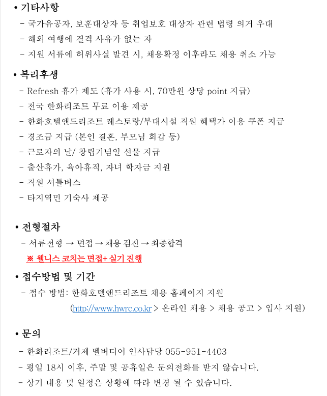 Refresh 휴가 제도(휴가 사용 시, 70만원 상당 point 지급), 전국 한화리조트 무료 이용 제공, 한화호텔앤드리조트 레스토랑/부대시설 직원 혜택가 이용 쿠폰 지급, 경조금 지급(본인 결혼, 부모님 회갑 등), 근로자의 날/ 창립기념일 선물 지급, 출산휴가(90일)/ 육아휴직(1년)/ 자녀 학자금 지원, 단체상해보험가입, 직원 셔틀버스, 타지역민 기숙사 제공 등 자세한 복리후생은 입사 후 안내