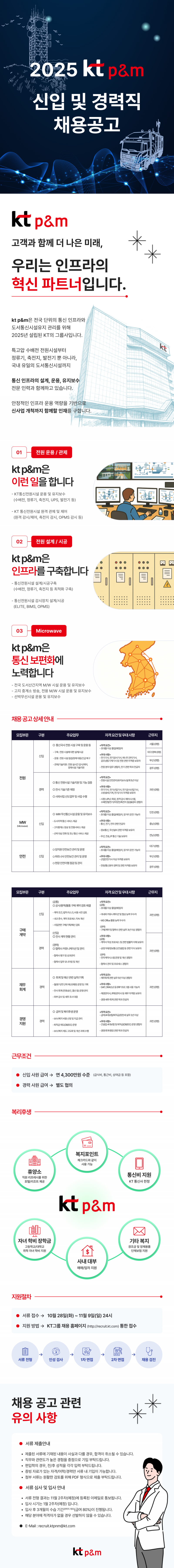 kt p&m은 KT의 통신 인프라 및 도서통신시설을 유지 관리하기 위해 2025년 1월에 설립된 KT의 그룹사입니다. 저희는 특고압 수배전 전원시설부터 정류기, 축전지, 발전기 뿐만 아니라, 국내 유일의 도서통신시설의 인프라 설계, 운용, 유지보수까지 가능한 전문인력을 보유하고 있습니다.