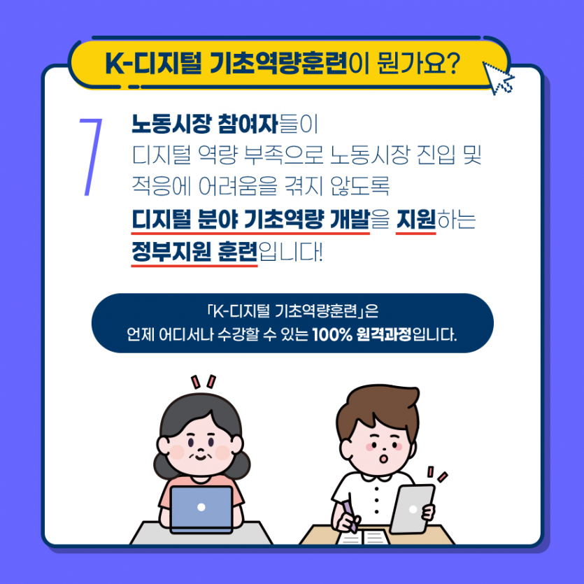 A. 노동시장 참여자들이 디지털 역량 부족으로 노동시장 진입 및 적응에 어려움을 겪지 않도록 디지털 분야 기초역량 개발을 지원하는 정부지원 훈련입니다.