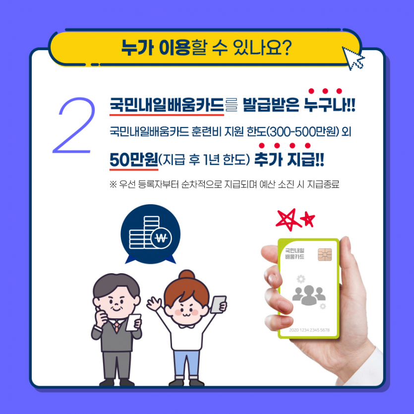 A. 국민내일배움카드를 발급받은 누구나! 국민내일배움카드 훈련지 지원 한도(300~500만원) 외 50만원(지급 후 1년 한도) 추가 지급!