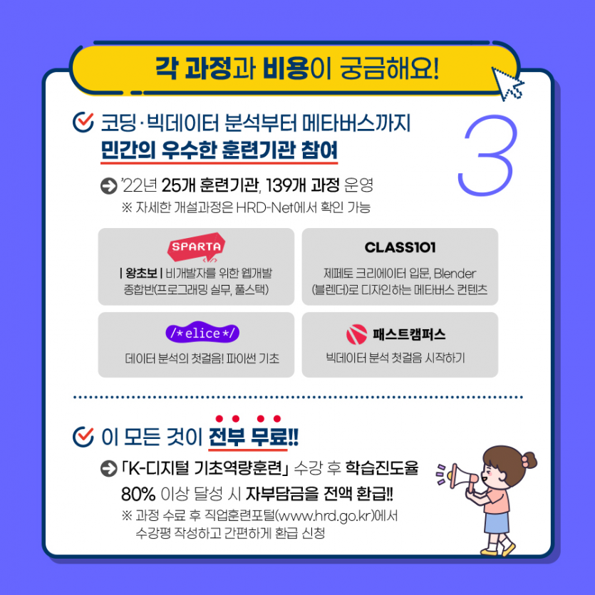 → 'K-디지털 기초역량훈련' 수강 후 학습진도율 80% 이상 달성 시 자부담금을 전액 환급