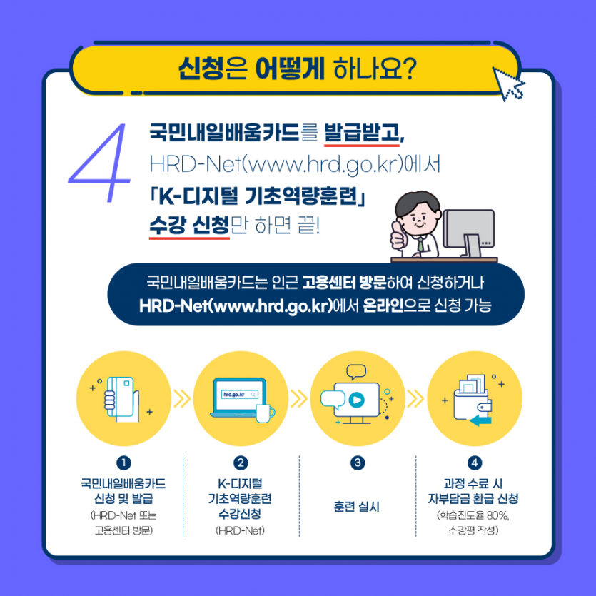 *국민내일배움카드는 인근 고용센터 방문해 신청하거나 HRD-Net(www.hrd.go.kr)에서 온라인으로 신청 가능