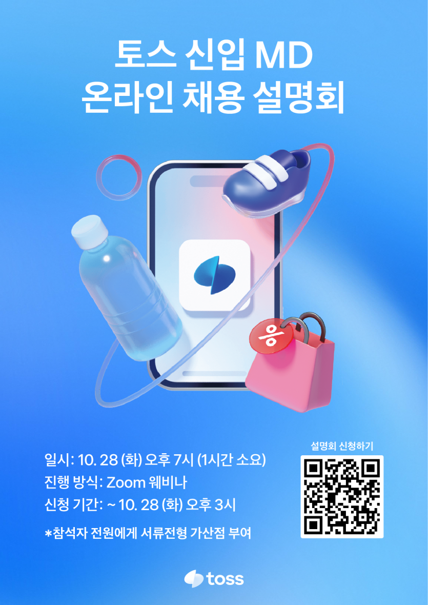 [토스 채용설명회 안내] 신입 MD 9기 채용설명회 개최 안내 페이지 정보 작성자 취업정보센터 댓글 0건 조회 60회 작성일 25-10-24 14:04 목록 본문 1. 행사명 : 토스 신입 MD 온라인 채용 설명회2. 일 시 : 10. 28(화) 오후 7시 (1시간 소요)3. 진행방식 : zoom 웨비나4. 참여혜택 : 참석자 전원에게 서류전형 가산점 부여 이전글[졸업생특화프로그램] 현직자멘토링 Connect 4차 대기업(LG화학, SK에너지) 프로그램 참여 신청 안내 25.10.24 다음글2025 대구·경북 채용박람회 개최 및 참여 신청 안내 25.10.21 댓글 0 댓글목록 등록된 댓글이 없습니다.